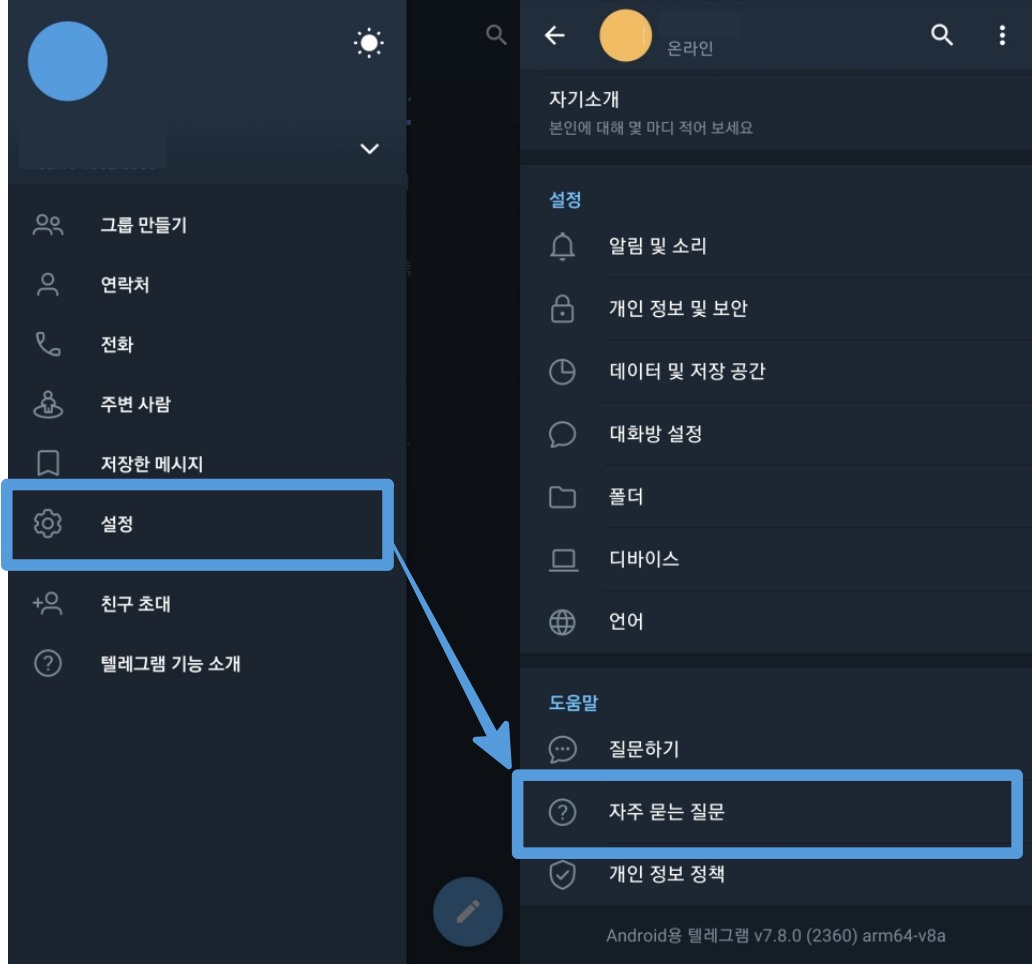 텔레그램 앱에 접속하셔서 설정화면에서 자주묻는 질문으로 들어갑니다.