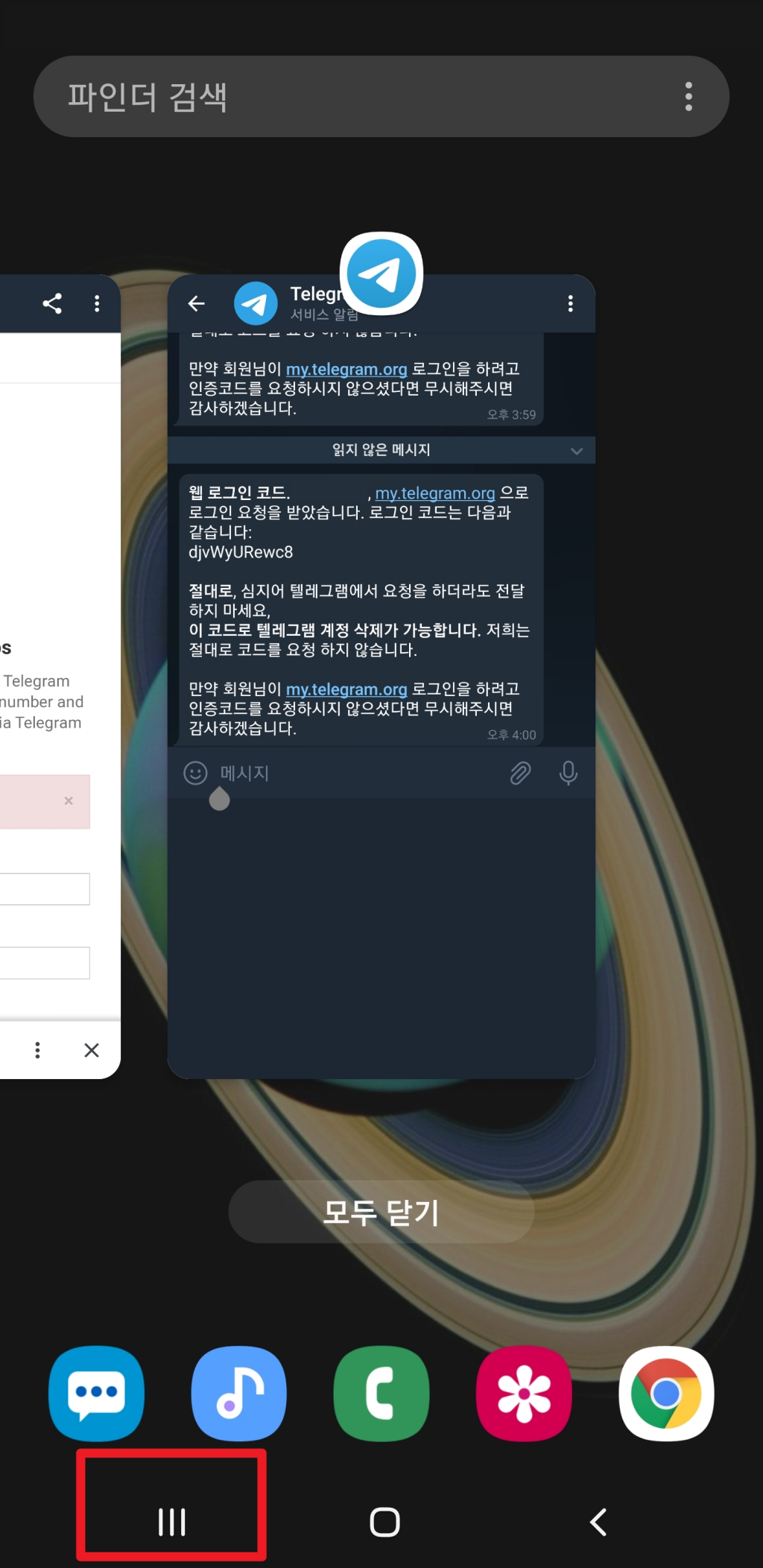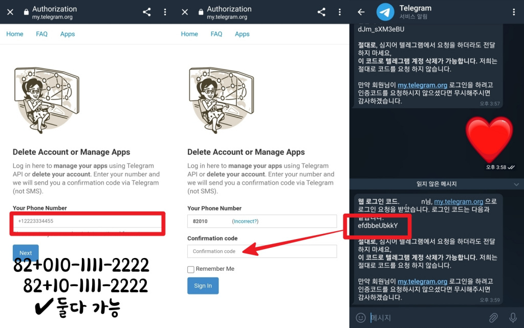 확인 코드를 복사하고 다시 입력란으로 넘어갈때 메세지에서 My.telegram.org를 눌러버리면 처음부터 다시해야 합니다.