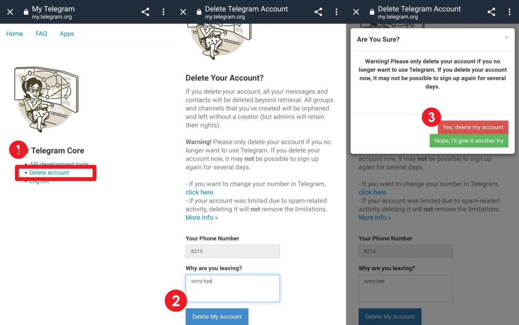 마지막으로 스마트폰에 날아온 텔레그램 확인 코드까지 입력하시면 위 사진처럼 뜨는데요 여기서 'Delete account' 계정삭제를 선택하시면 됩니다. 휴대폰 번호를 확인하시고 Why are you leaving? 이라는 항목에는 왜 텔레그램을 삭제하냐라고 설문조사를 하는것이니 아무말이나 적어도 무관합니다. Delete My Accout 를 선택하시면 정말 삭제할꺼냐? 라는 창이뜨게되고 빨간색 Yes delete my accout 를 선택하시면 텔레그램 계정이 완전히 삭제가 됩니다.
