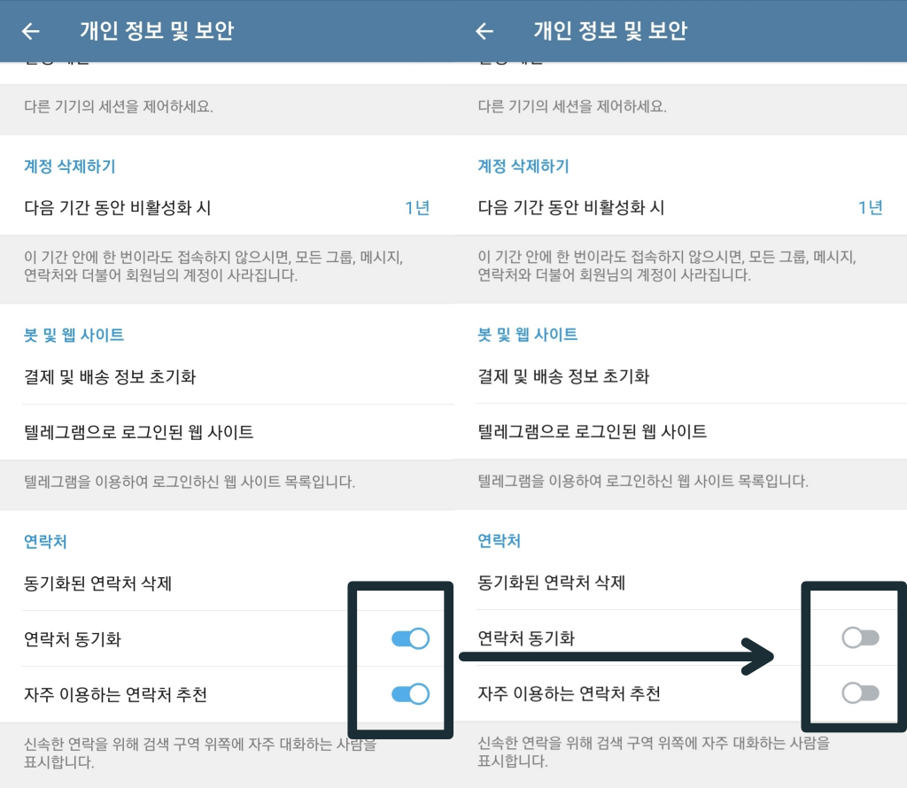 🔻연락처 동기화와 동기화된 연락처 삭제를 같이 해주시면 됩니다.